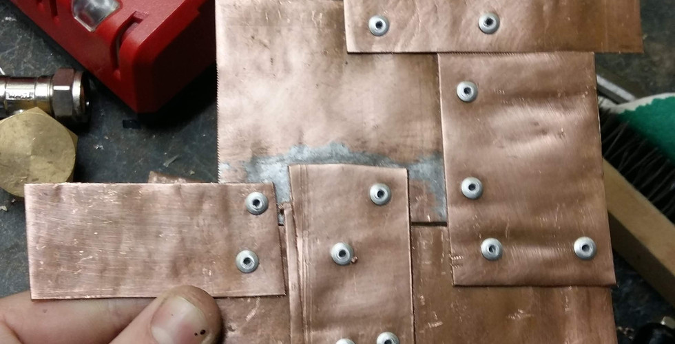 The Polished Peacock team likes to think of new ways of up-cycling our materials around us with minimal waste. From all of the copper scrap pieces from our lamps projects we are bending, flatting and riveting the copper together to create a new piece all will be revealed at later date!